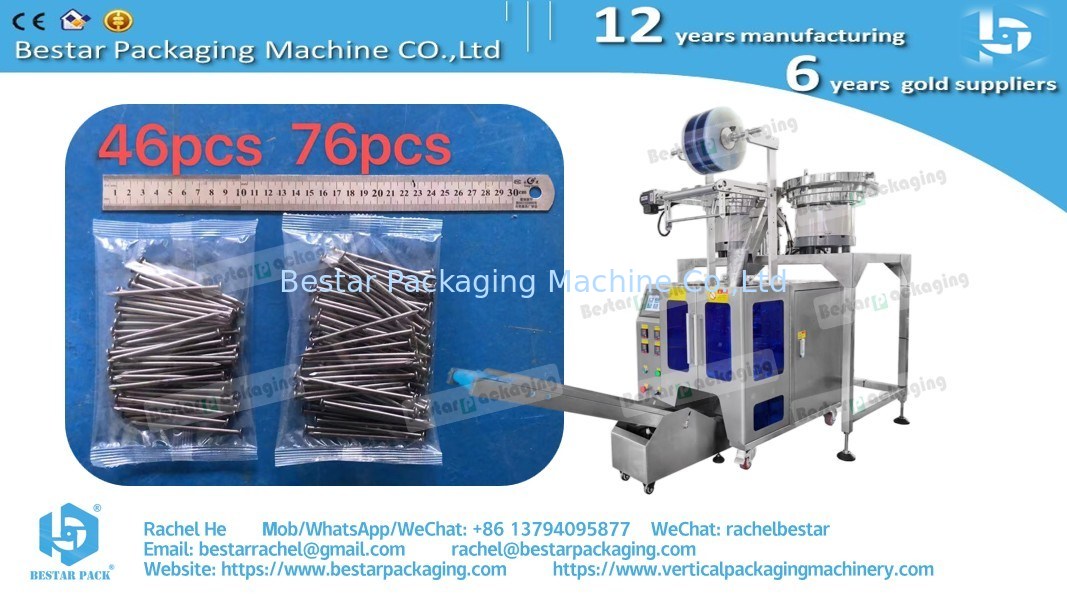Bestar automatic counting and packing machine, with two counting vibration bowls, which is suitable for long screws packaging. Machine with customized alignment device, making the long screws aligned inside the bag, making a compact package.